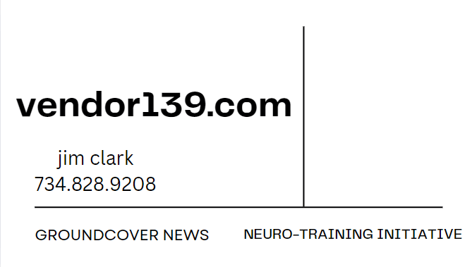 I am vendor 139. My name is Jim Clark, I have a goal. I am the founder of a program called the Neuro-Training Initiative. This program will teach people how to take conscious control of their own neurological processes. The training begins in a group home setting. I am using Groundcover News sales to buy the house that will be used as the group home.